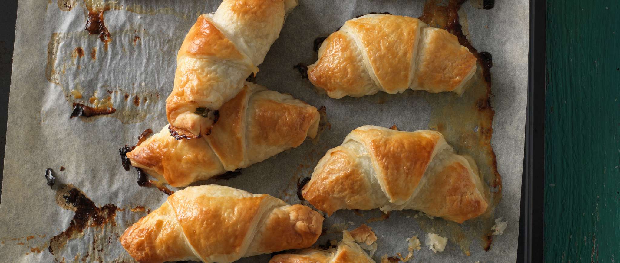 Gipfeli einrollen. Mit ein bisschen Ei bestrichen gehen die Gipfeli für ca